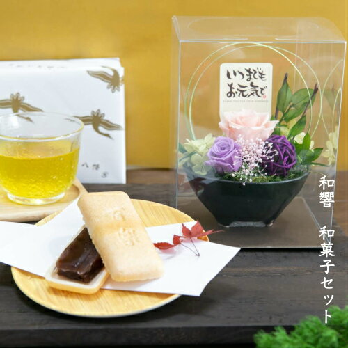 ご紹介するのは、プリザーブドフラワー 誕生日 和菓子 お歳暮 お礼 スイーツギフト 退職 送別 和風 長寿 お祝い 還暦 古希 喜寿 傘寿 米寿 白寿 卒寿 百寿 100歳 90歳 80歳 70歳 男性【送料無料 和響&和菓子セット】です。