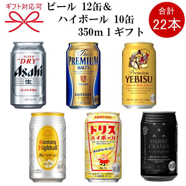 『ビール&ウイスキーハイボール350ml缶 22本ギフト』スーパードライ、ザ・プレミアムモルツエビスビール、角ハイボールトリスハイボール、ハリークレインズ結婚 お祝い 出産 内祝い お返し 御供物父の日 母の日 敬老の日 お中元 お歳暮 還暦」です。